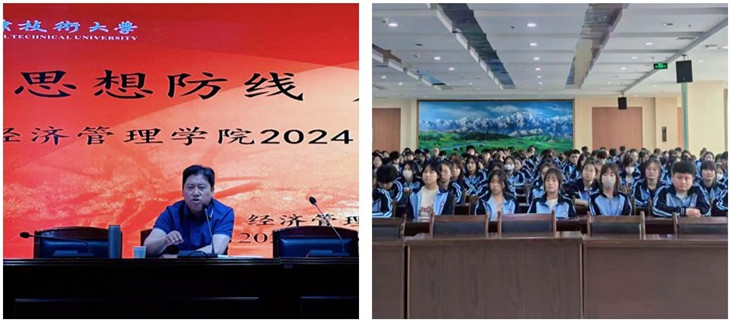 为进一步严明纪律要求,增强全体在校学生的规矩意识和法纪意识,经理管理学院于2025年5月8日和5月12日,分别面向2023级和2024级学生,召开了以“筑牢思想防线 严守纪律底线”为主题的警示教育大会。会议在图书馆四楼召开,经济管理学院院长张晓彬、2023和2024级班主任及全体在校生参加了会议,会议由副院长苏芸芸主持。