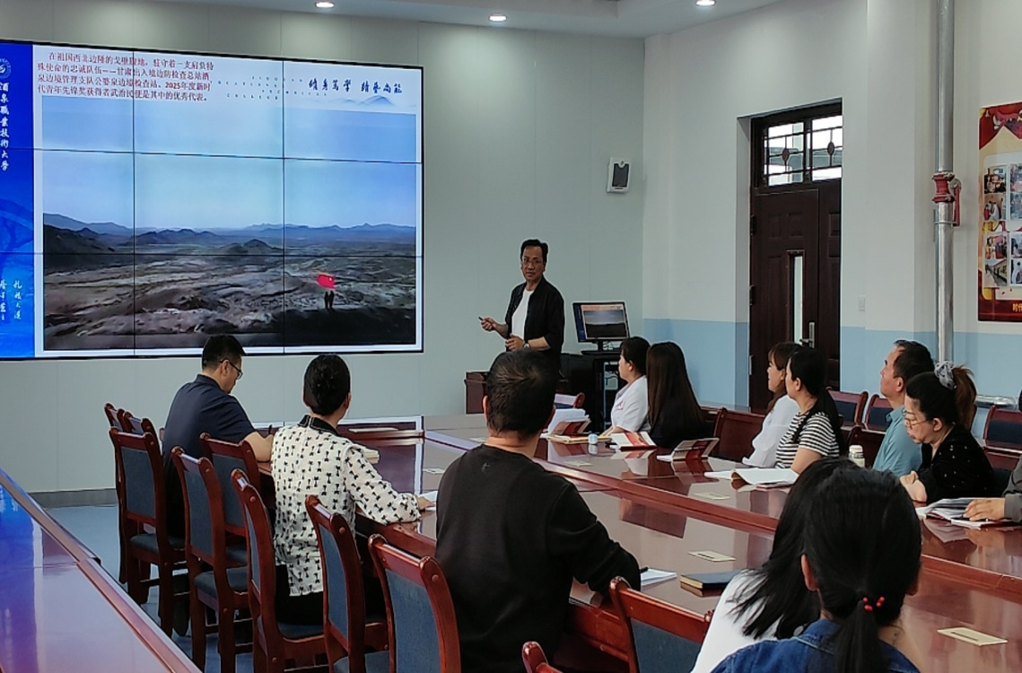 魏韡书记以习近平总书记最新讲话精神引出当代中国青年生逢其时,既迎来实现抱负的难得机遇,更肩负全面推进强国建设、民族复兴伟业的时代重任。引导医学院的青年教师,要弘扬永久奋斗的传统,立足本职岗位,勇于担当作为,为推动酒泉职业技术大学的发展贡献自己的力量。