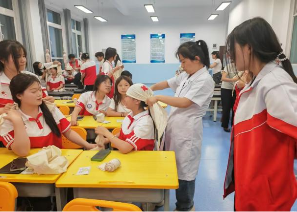 在止血与包扎部分,老师介绍了常见的止血方法,如指压止血、加压包扎止血等,以及绷带、三角巾的包扎技巧,包括头部、手臂等部位的包扎方式。学生在老师的指导下,使用模拟伤口和包扎材料进行实际操作,提升了动手能力。
