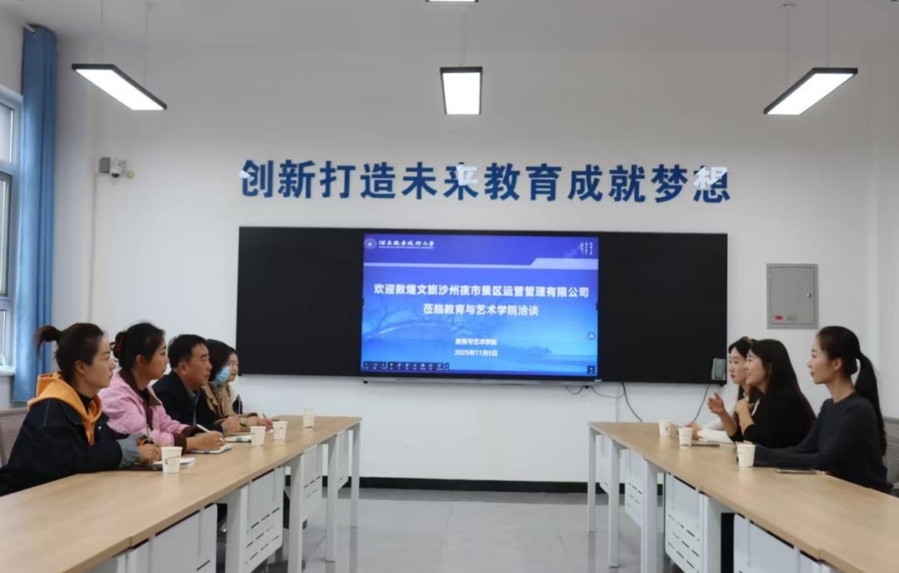 为精准对接区域人才发展需求,深化校企合作协同育人,进一步打通学生就业渠道,11月5日下午,敦煌文旅沙州夜市景区运营管理有限公司代表一行到访教育与艺术学院开展务实洽谈。学院党支部书记、院长梁志红、副院长于芳、副院长段君妍,及表演艺术专业教师代表马克斯文、石金蕊老师参加此次会议。