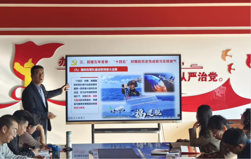 结合马克思主义学院学科特色与工作实际,聂峰同志从三个维度展开深入阐释:一是深刻把握中国式现代化的核心要义,强调“十五五”时期作为基本实现社会主义现代化的关键阶段,必须牢牢把握高质量发展首要任务,以科技自立自强引领新质生产力发展;二是精准领会全会精神的实践要求,指出要将“六个坚持”重要原则融入思政课教学改革、马克思主义理论研究等各项工作,推动理论阐释与时代需求同频共振;三是明确新时代马院人的使命担当,号召全体党员立足三尺讲台,把全会精神转化为课程思政的鲜活素材,在理论传播中强化思想引领力,在科研创新中服务国家发展大局。