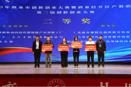 近日,2025年酒泉市创新创业大赛暨酒泉经开区产教联合体第二届创新创业大赛在我校圆满落幕。赛场上,我校参赛选手沉着应战、默契协作,在项目路演、现场答辩等关键环节中,以扎实的专业功底、敏锐的创新思维、高效的实践能力和清晰的商业逻辑,充分展现了我校学子在科技创新、产业赋能等方面的探索与成果,赢得了评委专家及各参赛单位的广泛认可与高度赞誉。经过激烈角逐,我校参赛团队《光催化覆膜孔板降解有机废水的先驱者》《大型退役风电设备循环高值利用技术在职业教育实训设备开发领域的技术研究及产业化》荣获二等奖;《移向莓好-戈壁智移莓仓》《光储一体化智能控制落地灯的研发及产业化》荣获三等奖;《天枢地链--灌区水利数字李生智控创芯先锋》《AI李生驱动的精准节水灌溉革命》荣获优胜奖。