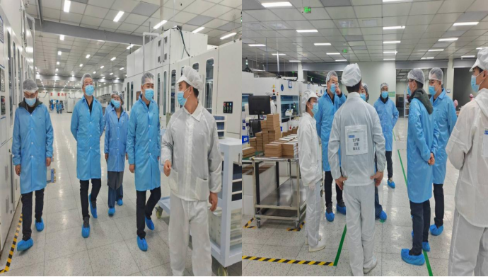 在甘肃金刚光伏有限公司的生产车间内,新能源工程学院张康、张云鹏副院长带领光伏教研室教师,跟随企业技术人员实地考察异质结电池生产线。调研团队身着洁净服,细致了解硅片加工、电池片制备等核心工艺环节,近距离感受行业前沿的智能制造技术,为后续校企合作、人才培养对接积累一线实践素材。