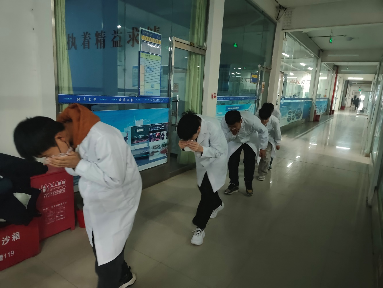 演练模拟实验室因酒精灯打翻引发初期火情。警报响起后,学院应急小组立即启动预案,组织师生沿预定路线快速、低姿态疏散。全体人员在两分钟内有序撤离至安全集结区,过程紧张高效。随后,安全负责人现场讲解并演示了灭火毯、干粉灭火器的正确使用方法,部分学生进行了实操体验。