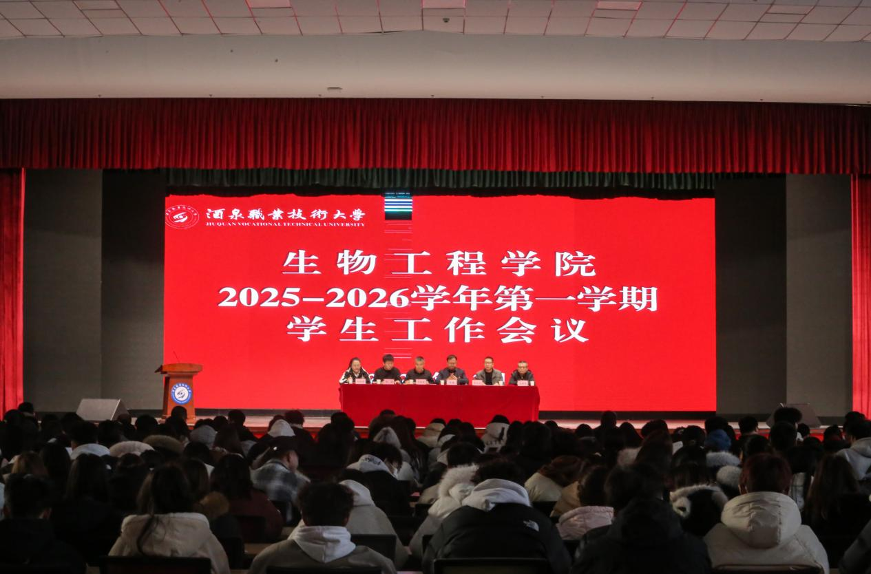 院系动态 > 正文为加强新学期学生教育管理工作,严明校纪校规,培育优良学风,营造安全、文明、健康、和谐的育人环境,12月12日下午,生物工程学院在胡杨文化活动中心组织召开了2025-2026学年第一学期学生工作大会。学院党支部书记、院长张涛、副院长王洪亮、副院长张又元、团委书记张超、全体辅导员班主任及各班级学生干部、学生代表参加了会议。会议由张又元主持。