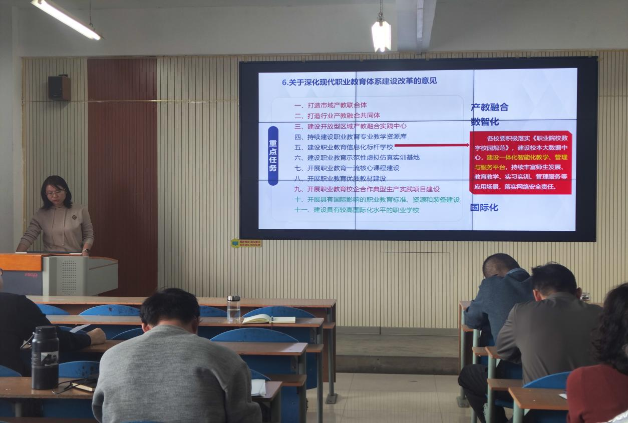 当日下午,学院聚焦教育教学关键要素改革组织专题学习,由副院长张海涛主讲。他深度解读了《教育部关于深化职业教育教学关键要素改革的意见》,围绕专业、课程、教材、教师、实习实训等核心要素展开剖析,并结合第二期高水平高职学校专业建设案例,探讨了专业优化与产业对接的有效路径。学习使教师们进一步凝聚了“以改促教”的共识,明确了对接行业需求、提升人才培养质量的方向。
