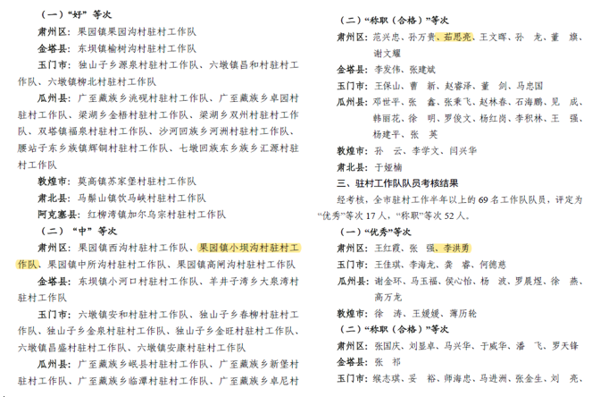 尤为可喜的是,驻果园镇丁家闸村工作队队员李洪勇脱颖而出,在全市69名驻村半年以上工作队队员考核中获评“优秀”等次,成为肃州区获评该等次的三名队员之一,其扎根基层、实干笃行的帮扶作风与工作实绩获得市级考核组高度认可。