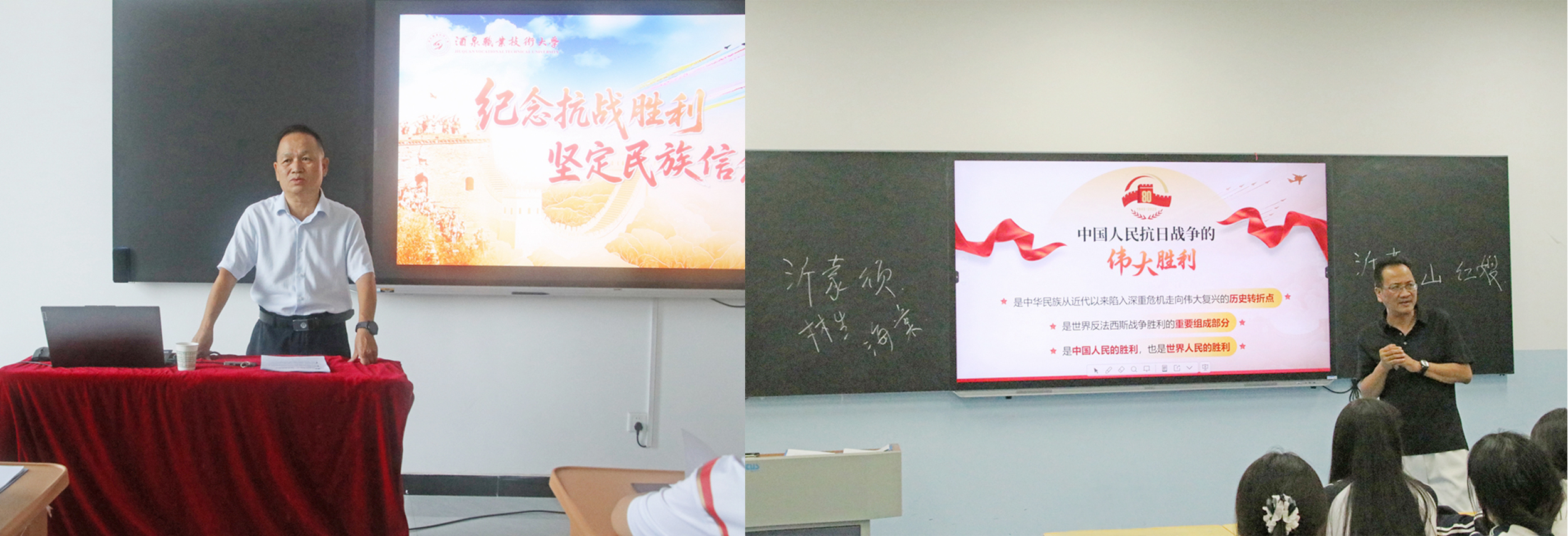 2025年是中国人民抗日战争暨世界反法西斯战争胜利80周年,为深入学习贯彻习近平总书记关于弘扬伟大抗战精神的重要论述。2025年9月3日-9月5日,酒泉职业技术大学开展“同上一节思政课”活动,引导全体教职工和学生铭记历史、缅怀先烈、弘扬伟大爱国主义精神、伟大抗战精神。校党委班子成员深入课堂,为学生讲授思政课。